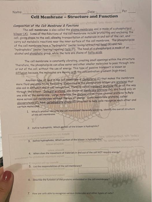 Phospholipid: Definition, Structure, Function - Biology Dictionary Hydrophobic - a molecule that "hates water"; it is not attracted to water, but will usually dissolve in oils or fats. Lipid bilayer - a double layer of phospholipids that makes up the cell membrane and other membranes, like the nuclear envelope and the outside of mitochondria. Quiz 1. Which is NOT a component of a phospholipid? A. Glycerol Phospholipid Structure & Function | What is a Phospholipid? Phospholipids have both a hydrophobic tail and a hydrophilic head. Hydrophobic means water fearing, in other words, the fatty acid tail (the hydrophobic portion of the phospholipid) does not mix... PDF Name Date Per Cell Membrane Structure and Function Label the hydrophobic and hydrophobic portions of the phospholipids. Match the cell membrane structure or its function with the correct letter from the diagram. _____ Attracts water _____ Repels water _____ Helps maintain flexibility of membrane _____ Makes up the bilayer (2 answers) _____ Involved in cell-to-cell recognition Cambridge International AS and A Level Biology Coursebook … Enter the email address you signed up with and we'll email you a reset link.
