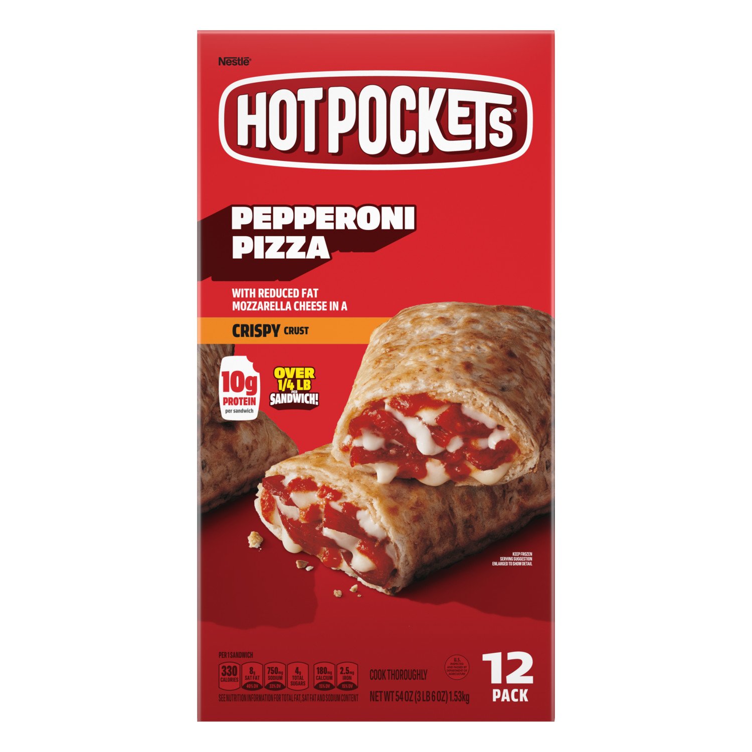 Hot Pockets Pepperoni Pizza 30 x 4 ounces - Nestlé Professional Hot Pockets Pepperoni Pizza 30 x 4 ounces, Hot Pockets Pepperoni Pizza 30 x 4 ounces, Signature pepperoni, cheese and rich marinara packed into a crispy crust topped with Italian-style herbs and breadcrumbs. Portable snackability is perfect for on the go! Good Source of Protein, Made with Real Cheese, No Artificial Flavors, Nestle Code: 12495730, Calories in Hot Pockets Sandwiches, Pepperoni Pizza, Crispy Crust ... 360 Calories, Quantity, , sandwich (4.5 oz) Serving, Add To Compare, 0/8, Nutrition Facts, Calorie Burn Time, How long would it take to burn off 360 Calories of Hot Pockets Sandwiches, Pepperoni Pizza, Crispy Crust, Frozen? Swimming, 30 minutes, Jogging, 41 minutes, Cycling, 55 minutes, Walking, 100 minutes, 12 PEPPERONI HOT POCKET CHALLENGE! | 4000+ CALORIES - YouTube WADDUP EVERYONE! TODAY, Ray & Mario went head to head in a 12 HOT POCKET CHALLENGE! They each had 12 Pepperoni Hot Pockets, which is a whomping 4000+ Calorie...