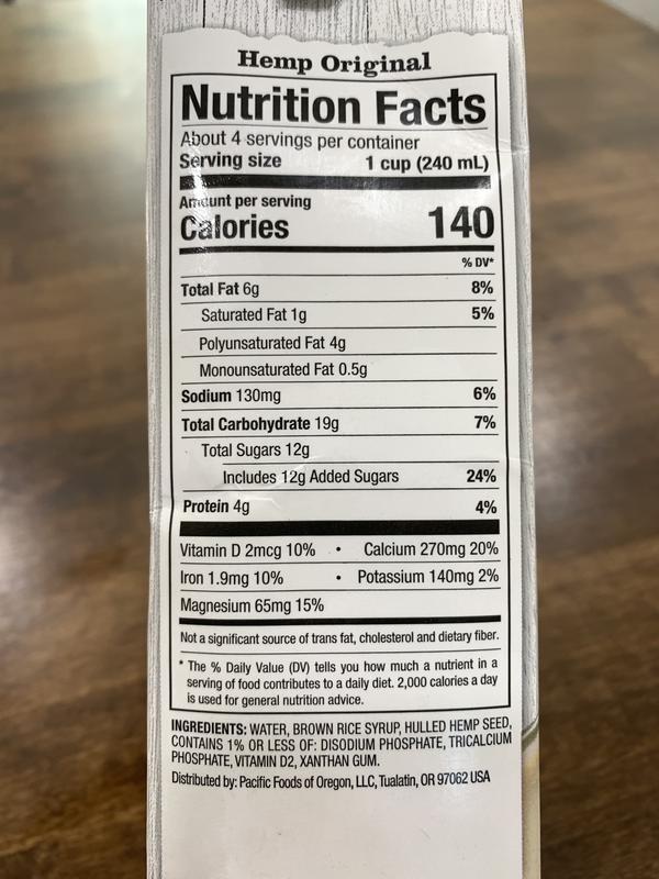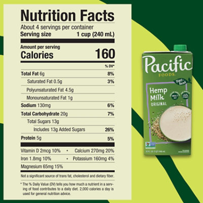 Hemp Unsweetened Original Beverage - Pacific Foods Nutrition Facts: About 4 Servings Per Container: Serving size: 1 Cup (240mL) Amount per serving: Calories 60 % Daily Value * Total Fat: 4.5g: 6%: Saturated Fat: 0g: ... Water, Hulled Hemp Seed, Contains 1% Or Less Of: Disodium Phosphate, Gellan Gum, Natural Vanilla Flavor With Other Natural Flavors, Tricalcium Phosphate, Vitamin D2, Xanthan Gum