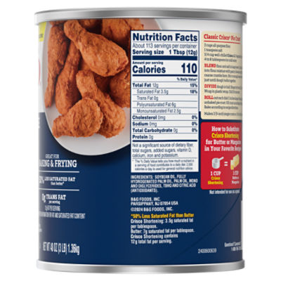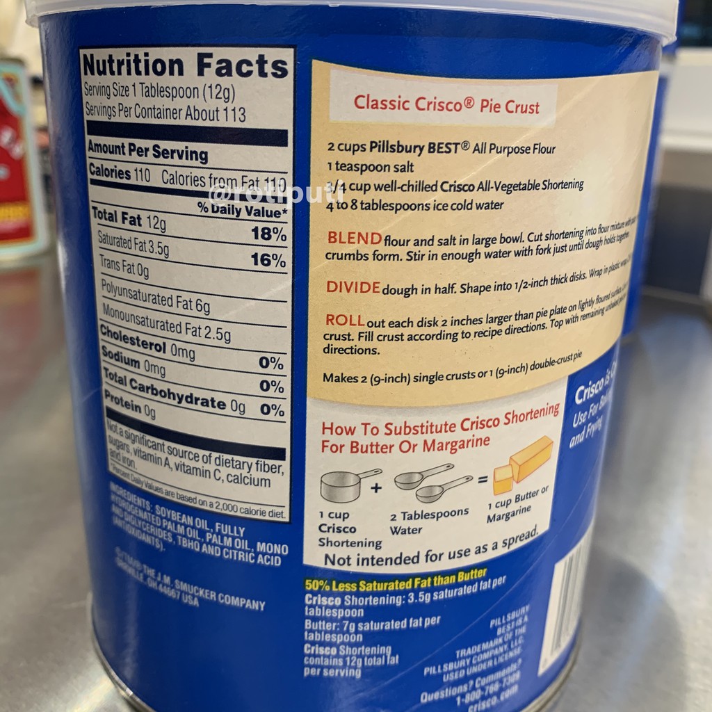 CRISCO LABEL RECIPES All You Need is Food - Stevehacks Apr 15, 2022 · Crisco: Companies can get away with saying their products have "zero trans fats" when they have 0.5 grams or less but that doesn't make them trans fat free. Keep that in mind when using Crisco shortenings, as hydrogenated oils are still in the label… From newhealthadvisor.org › ip › Crisco-Butter-Flavor-AllCrisco Butter Flavor All-Vegetable Shortening 48 oz. Canister ... Per 1 Tbsp: 100 calories; 3.5 g sat fat (16% DV); 0 mg sodium (0% DV); 0 g total sugars. 50% Less Saturated Fat than Butter: Crisco Shortening: 3.5 saturated fat per tablespoon. Butter: 7 g saturated fat per tablespoon. Crisco Shortening contains 12 g total fat per serving. Gluten free. 50% less saturated fat than butter.