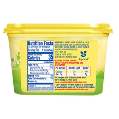 I Can't Believe It's Not Butter Nutrition Information The product does not contain hydrogenated oil or trans fat. According to I Can't Believe It's Not Butter's website, each 1-tbsp. serving provides 70 calories, 8 g total fat, 2 g saturated fat, 3.5 g polyunsaturated fat, 2.5 g monounsaturated fat and 90 mg sodium. What is bad about I cant believe its not butter? - TimesMojo I Can't Believe It's Not Butter! Original contains 60 calories per tablespoon serving and 70% less saturated fat per serving compared to butter. … The American Heart Association Heart-Check certification applies only to the I Can't Believe It's Not Butter! Is there any dairy in I cant believe its not butter? Contents I Can't Believe It's Not Butter!, Buttery Spray, Original, 8 oz I Can't Believe It's Not Butter! Spray gives you great butter taste with 0g fat, 0 calories and 0g trans fat per serving.* *I Can't Believe It's Not Butter! Spray contains 0g fat, 0g trans fat and 0 calories per 5 sprays. **When used as a topping, the amount of sodium per serving is 15mg, 1% of the daily value of sodium (less than 2400mg). Spray Butter ( 25 Sprays = Calories) - myfitnesspal.com I Can't Believe It's Not Butter Spray Butter ( 25 Sprays = Calories) Serving Size: 1 sprays (1 teaspoon) 20 Cal 0% -- Carbs 100% 2g Fat 0% -- Protein Track macros, calories, and more with MyFitnessPal. Join for free! Daily Goals How does this food fit into your daily goals? Calorie Goal 1980 Cal 20/2000Cal left Fitness Goals: Heart Healthy Fat 65 g