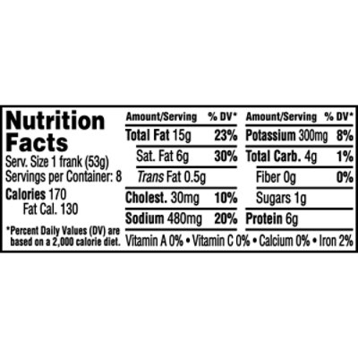 Carbs in ballpark beef hot dogs. All Beef Hot Dog Calories - CaloriesTalk.com A hot dog made of beef and pork, served without the bun, also weighs 57 grams and provides 162 calories. This includes almost 6 grams of protein, 14 grams of fat, 3 grams of carbs and 562 milligrams of sodium. You can also get hot dogs made with beef only, which some people opt for due to dietary restrictions or personal preference. How Many Calories In A Ball Park Hotdog? - L'Espresso Bar Mercurio How many calories are in a ball park Angus beef hot dog? Serving Size 1 Frank (50g), Amount Per Serving: Calories 160, Calories from Fat 130, Total Fat 15g (23 percent of the Daily Value), Saturated Fat 6g (30 percent of the Daily Value), Trans Fat 0.5g, Cholesterol 30mg (10 percent of the Daily Value), Sodium 490mg (20 percent of the Daily ... Calories in Ball Park Beef Hot Dog - SparkPeople Ball Park Beef Hot Dog (1 serving) Calories: 180, Fat: 16g, Carbs: 3g, Protein: 6g Show full nutrition information Ball Park Beef Hot Dog 1 Frank (1 serving) Calories: 180, Fat: 16g, Carbs: 3g, Protein: 6g Show full nutrition information Ball Park Beef Hot Dog (1 serving) Calories: 180, Fat: 16g, Carbs: 3g, Protein: 6g Bun Size Beef Hot Dogs | Ball Park® Brand Bun Size Beef Hot Dogs | Ball Park® Brand Bun Size Beef Hot Dogs We beefed up our beef hot dogs, and wound up with this bun-size masterpiece. 8 count 16 count ★★★★★ ★★★★★ 4.7 (675) Write a Review How to Prepare Nutrition + Ingredients find in-store MADE with 100% beef NO added nitrates or nitrites* NO by-products or fillers NO