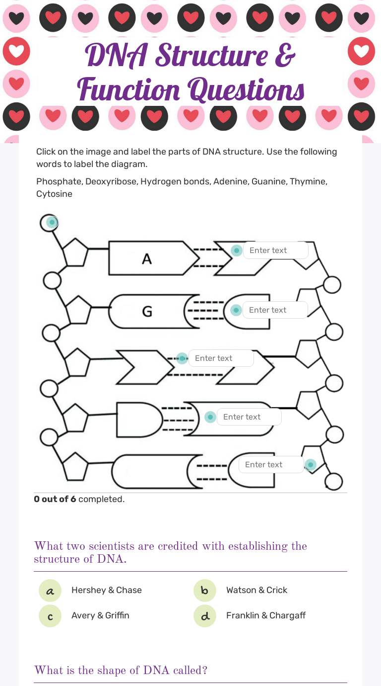 DNA Helix Base Labeling worksheet - liveworksheets.com DNA Helix Base Labeling DNA Helix Base Labeling ID: 1221367 Language: English School subject: Biology Grade/level: 9-12 Age: 9+ Main content: Dna ... More Dna interactive worksheets. Dna by eman1988: DNA and replication by cohenbio: DNA Chargaff's Rule Practice by MsStefany: Chapter 4.1(a) by madamazura: Dna
