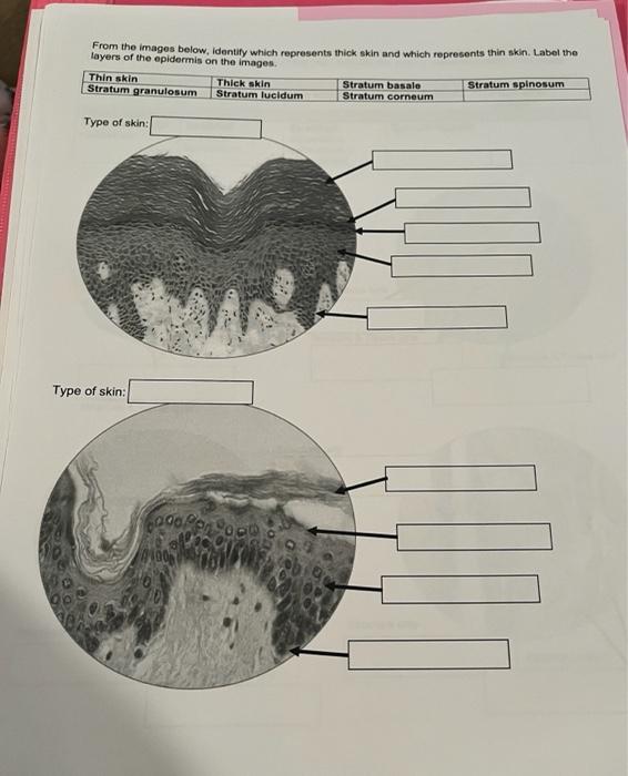 5 layers of the epidermis - LORECENTRAL 2) Spiny layer. 3) Granular layer. 4) Lucid stratum. 5) Stratum corneum (corneal layer). Stratum corneum (stratum corneum) The most superficial layer of the epidermis is formed by dead, flat and thin squamous cells that detach continuously, being replaced by others. The cytoplasm of these cells has been replaced by a hydrophobic protein: keratin . 5. Label the layers of the epidermis in thick skin. Then, complete th ... Label the layers of the epidermis in thick skin. Then, complete the statements that follow Stratum orneum stratum lucidro Stratum Gronilos stratum spinusun Saruto Dusu a. Glands that respond to rising androgen levels are the qualsias glands. are epidermal cells that play a role in the immune response. Skin Histology Slide Identification - Thick and Thin Skin Microscope ... In the thin skin histology slide, you will find the following five (5) layers and four (4) different types of cells. I will go through the detailed description of these layers and cells of the epidermis. #1. Stratum basale layer #2. Stratum spinosum layer #3. Stratum granulosum layer #4. Stratum lucidum layer and #5. Stratum corneum layer Epidermis layers and Skin (Thick & Thin) Flashcards | Quizlet Order of Epidermis layers from deepest to superficial Basale Layer, Stratum Spinosum, Stratum Granulosum, Stratum Lucidum, Stratum Corneum, Basale Layer Single layer of cuboidal to low columnar cells. There are 3 types of cells that occupy the basale layer Keratinocytes (cell that occupies the basale layer)